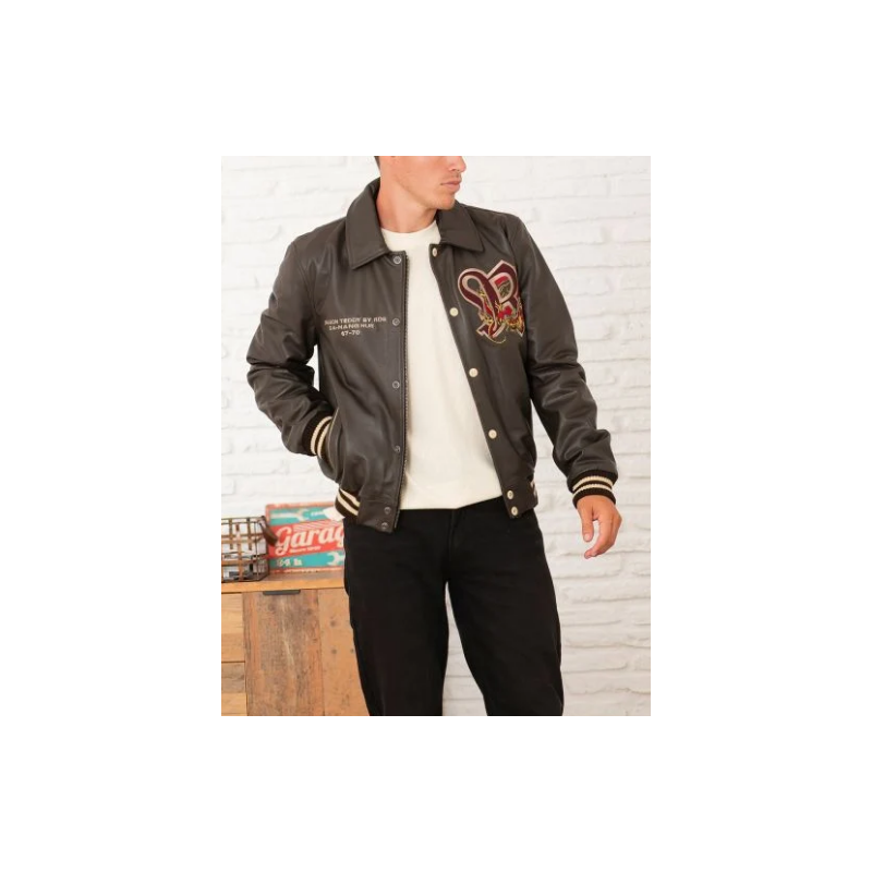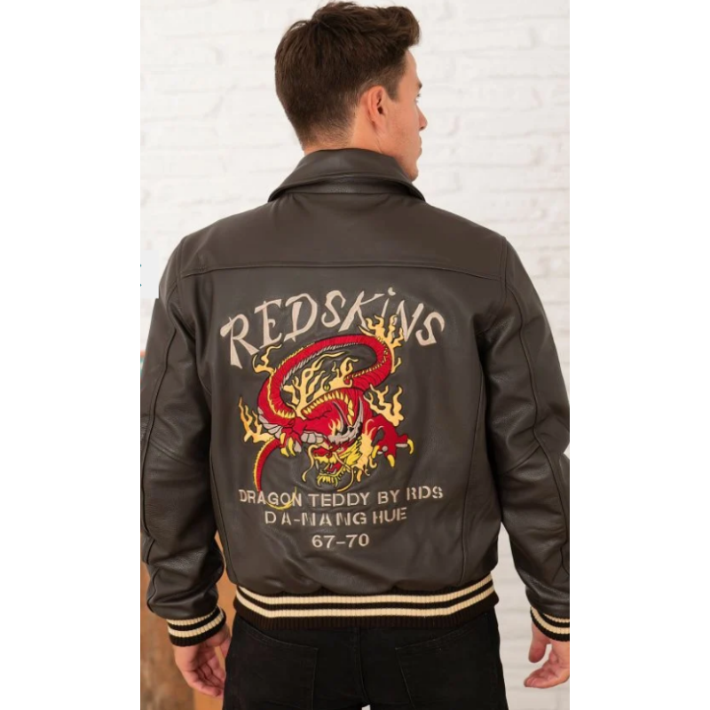 Découvrez le CUIR DRAGON COHIBA, broderie d'un dragon et de "Redskins" dans le dos, broderie "R" sur la face avant gauche et broderie d'un petit texte sur la face avant droite, 2 poches passepoilées latérales, fermeture à boutons de pressions, parfait pour un style moderne et attrayant, composition : cuir de vache.