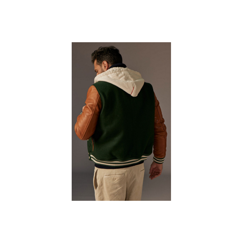 Sa composition en cuir d'agneau et en drap de laine garantit une qualité supérieure et un confort optimal. Le blouson présente une base verte, accentuée par des manches en cuir marron, offrant ainsi un contraste de textures qui enrichit son esthétique.